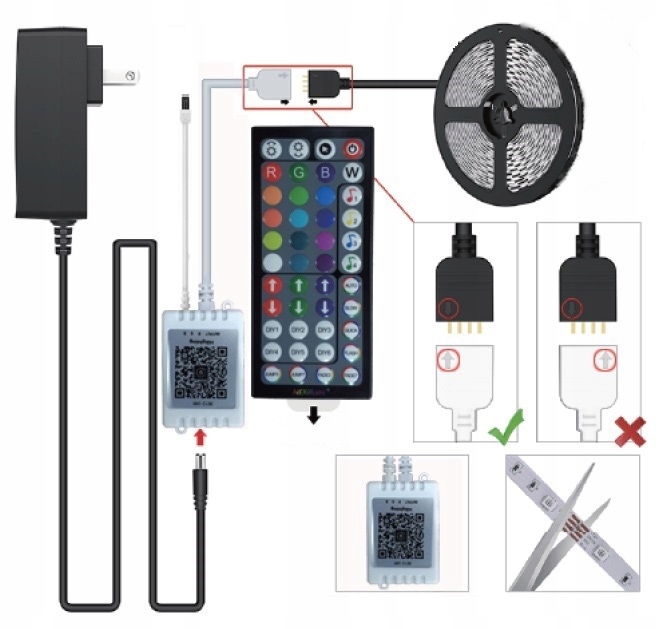- Conectează banda LED la controler, asigurându-te că săgețile sunt orientate corect.
