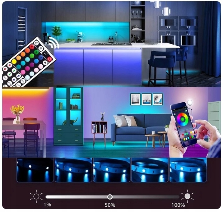 Banda LED poate fi controlată atât prin aplicație, cât și cu ajutorul unei telecomenzi IR care vine inclusă în pachet. Controlerul permite schimbarea luminii LED în diverse variante, precum și sincronizarea iluminatului cu muzica, aducând un efect plăcut și dinamic.