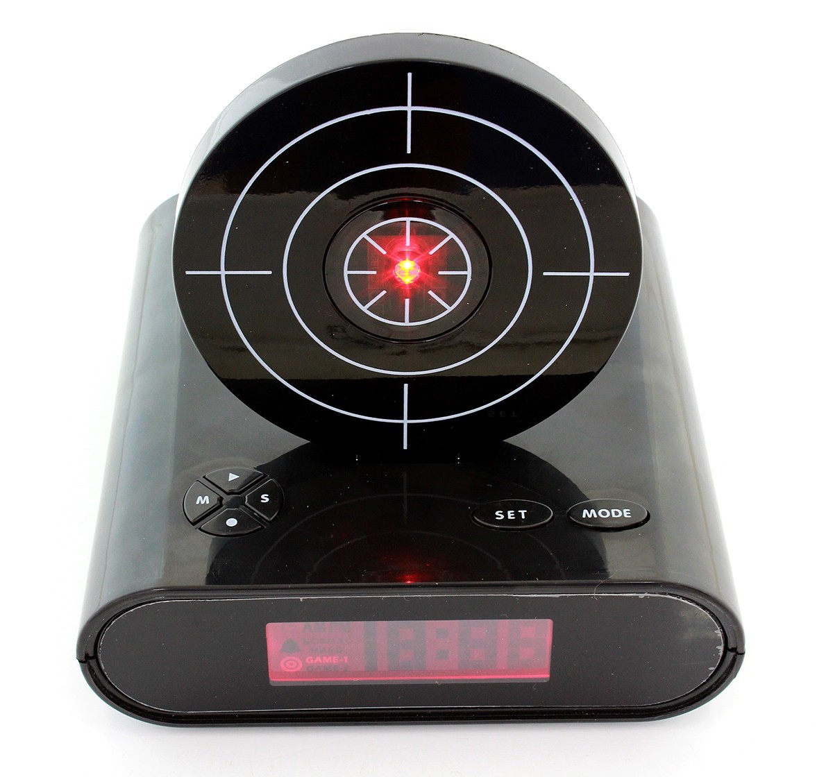 Ceas desteptator cu oprire alarma cu pistol infrarosu, ce poate fi un cadou perfect pentru cineva care nu se poate trezi usor dimineata.