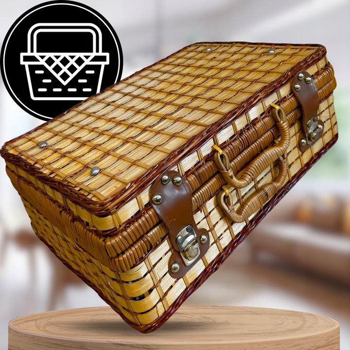 - 1 coș de picnic din răchită naturală, cu zăvoare metalice și mâner