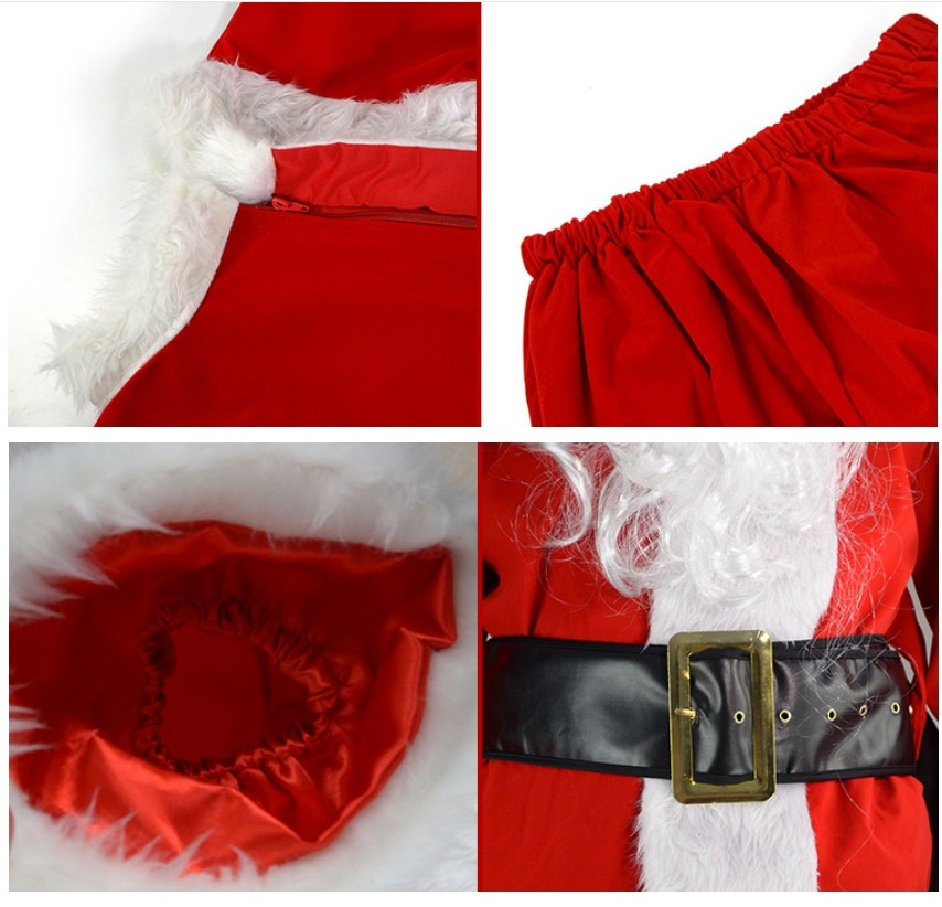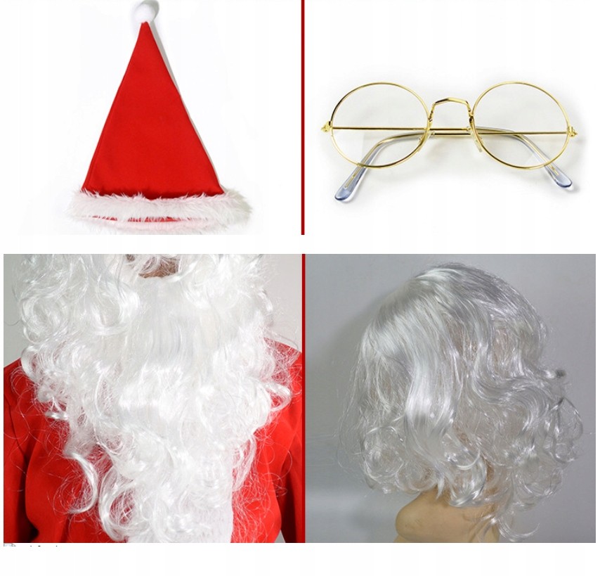Este format dintr-o barba alba, caciula, bluza, pantaloni, cizme, peruca, manusi, ochelari, centura si sac.