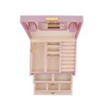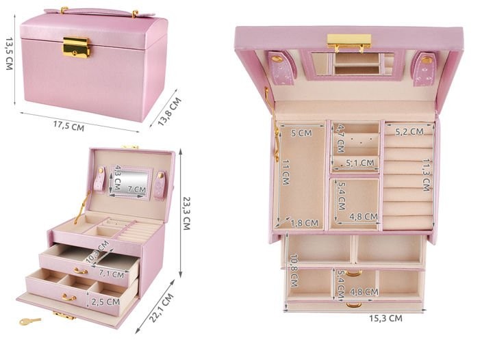 Este prevazuta cu 20 de compartimente in care pot fi depozitate bijuteriile. Cutia are un sistem de inchidere cu cheie, ceea ce ofera securitate pentru continutul din interiorul acesteia.