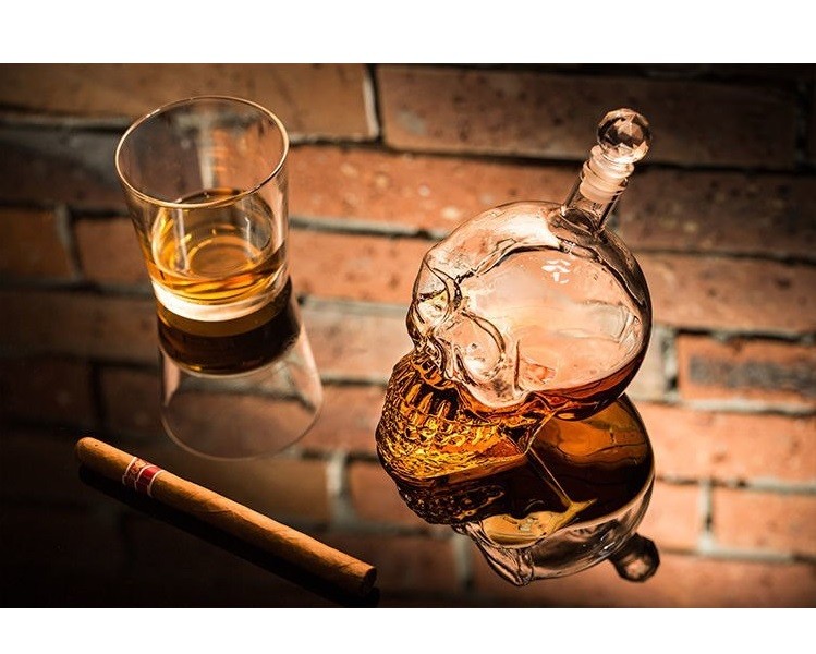 Decantor din sticla in forma de craniu, perfect pentru petreceri.