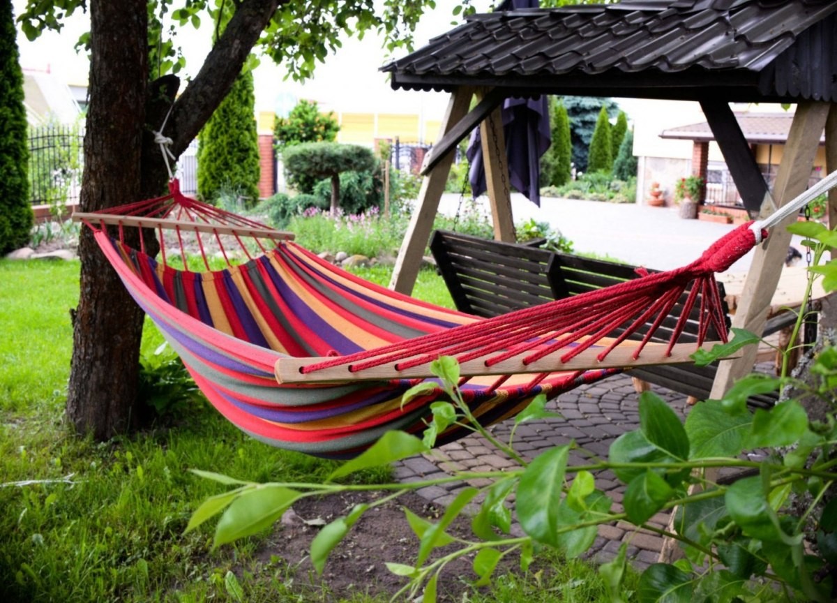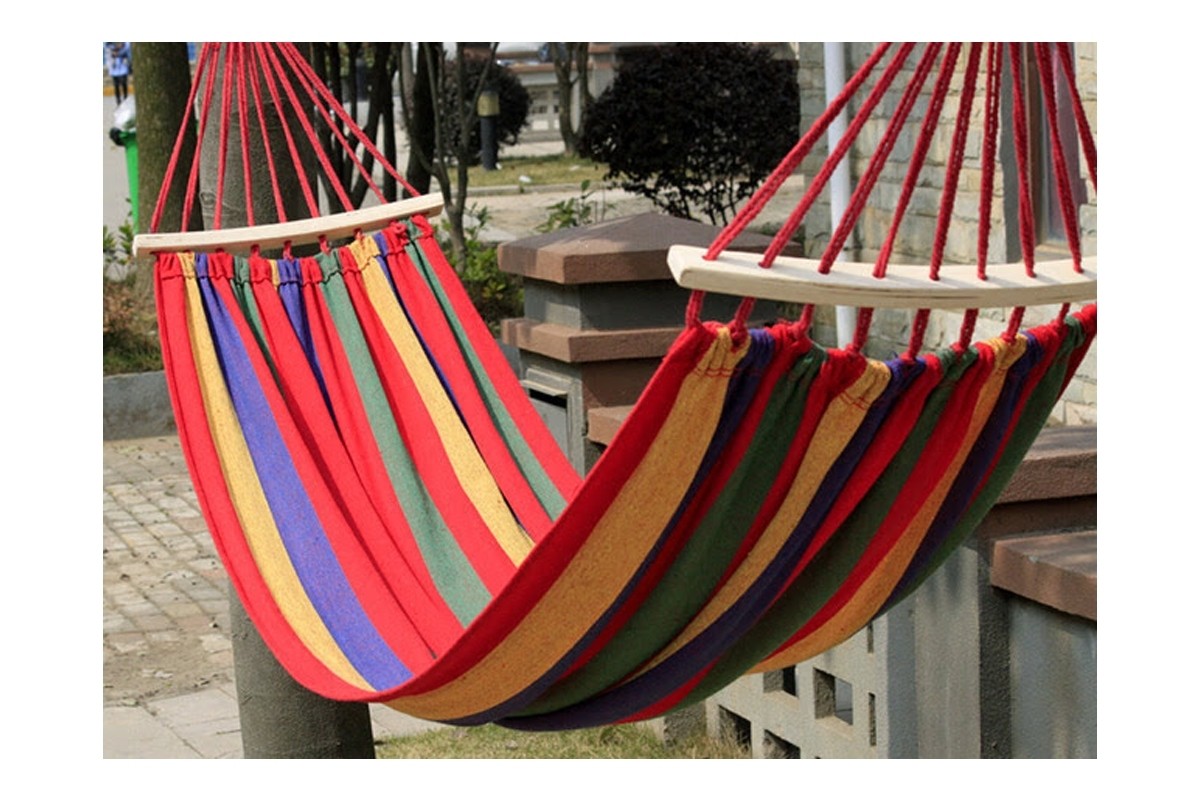 Hamac din bumbac si poliester, potrivit pentru a va petrece timpul liber in aer curat.