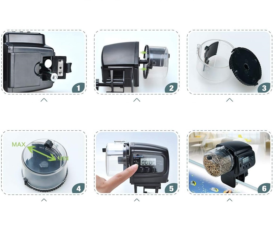 Distribuitorul automat de hrana pentru pesti are un maner reglabil, ce permite montarea dispozitivului cu usurinta atat pe capac cat si pe peretii acvariului.