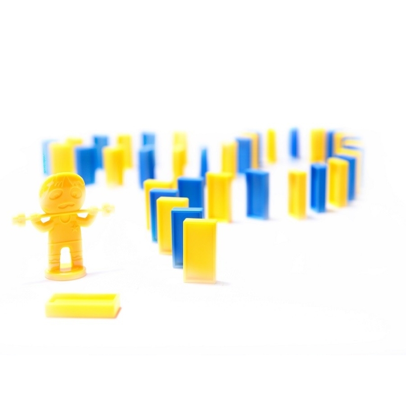 O locomotiva interactiva colorata care aranjeaza blocuri de domino.