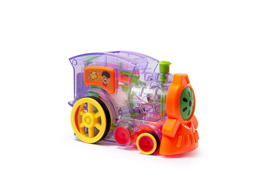 O locomotiva interactiva colorata care aranjeaza blocuri de domino.