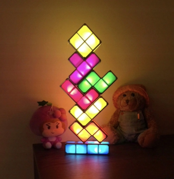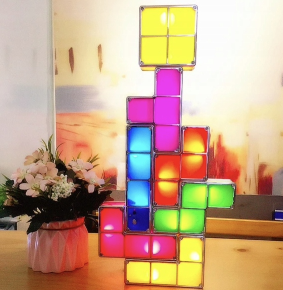 O lampă retro elegantă și atemporală cu elemente Tetris neon fermecătoare.