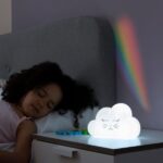 Lampa are forma unui nor si emite lumina alba, iar pe spate proiecteaza un curcubeu pe perete.