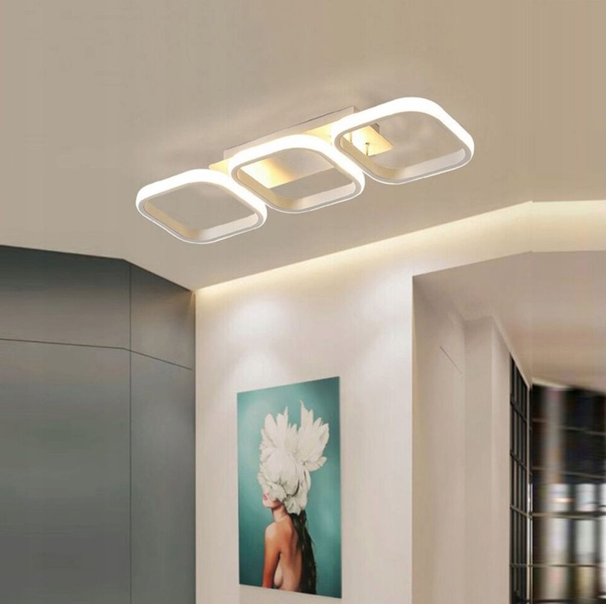 - Design modern cu 3 benzi LED rotunjite, estetice și eficiente.