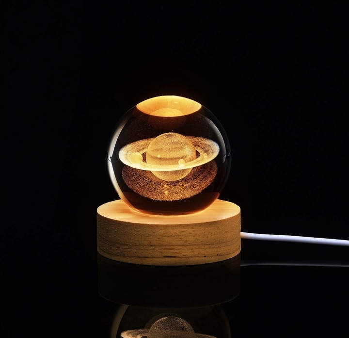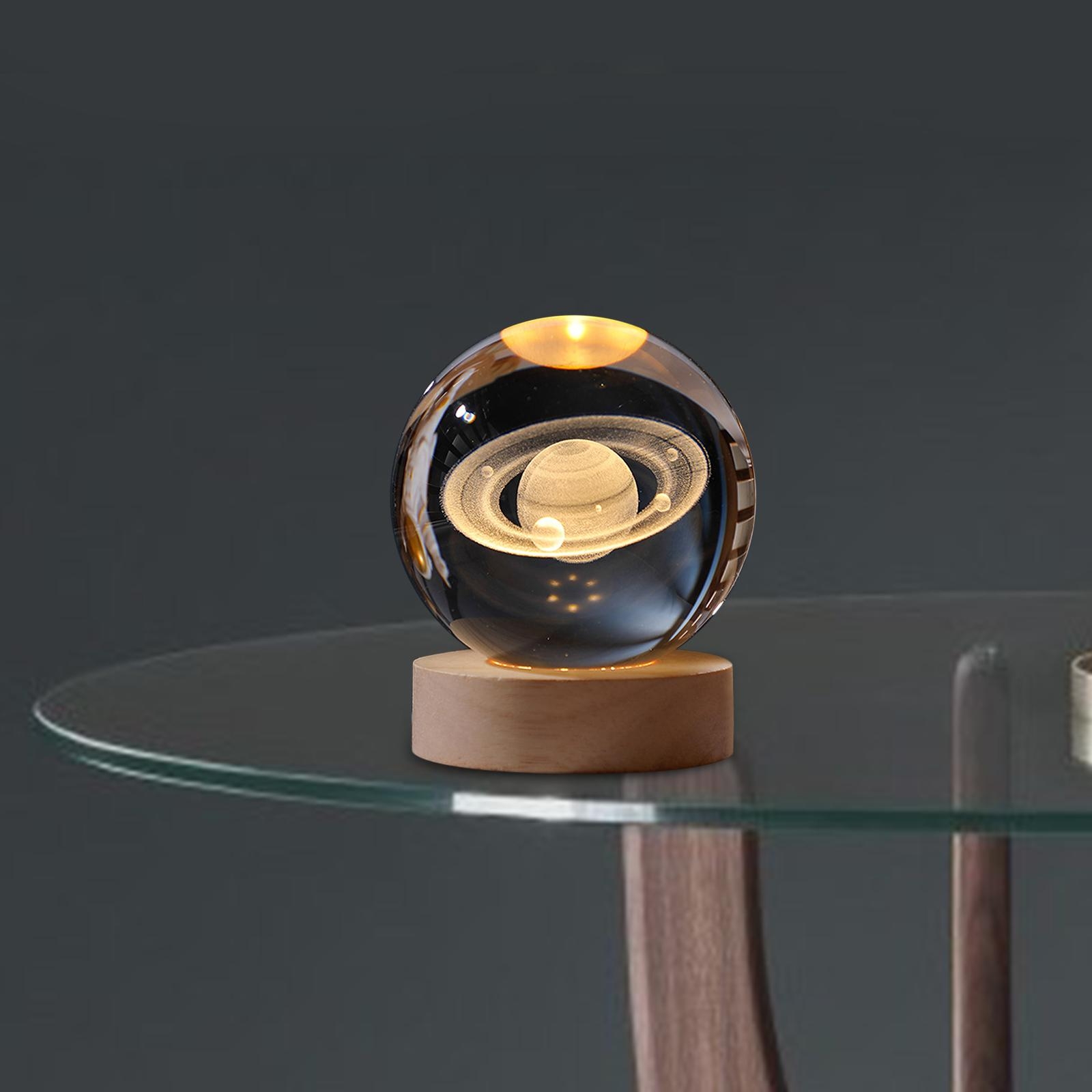 Lampa LED decorativa, cu bila de cristal cu diametru 6cm, model Saturn 3D, suport din lemn, Gonga®