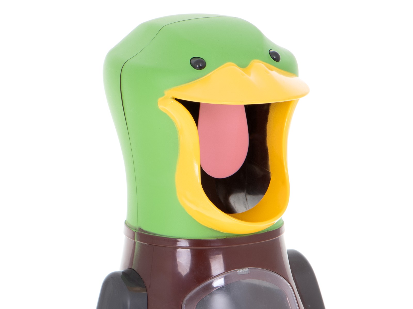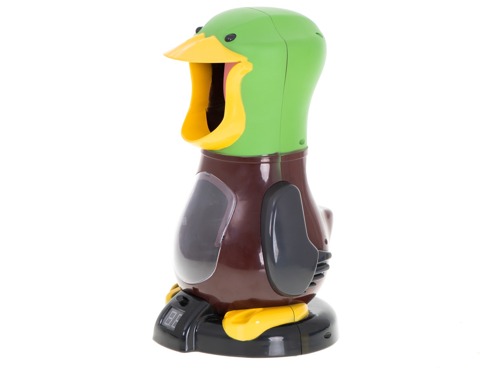 Când glonțul lovește limba raței, jucăria redă un sunet caracteristic.