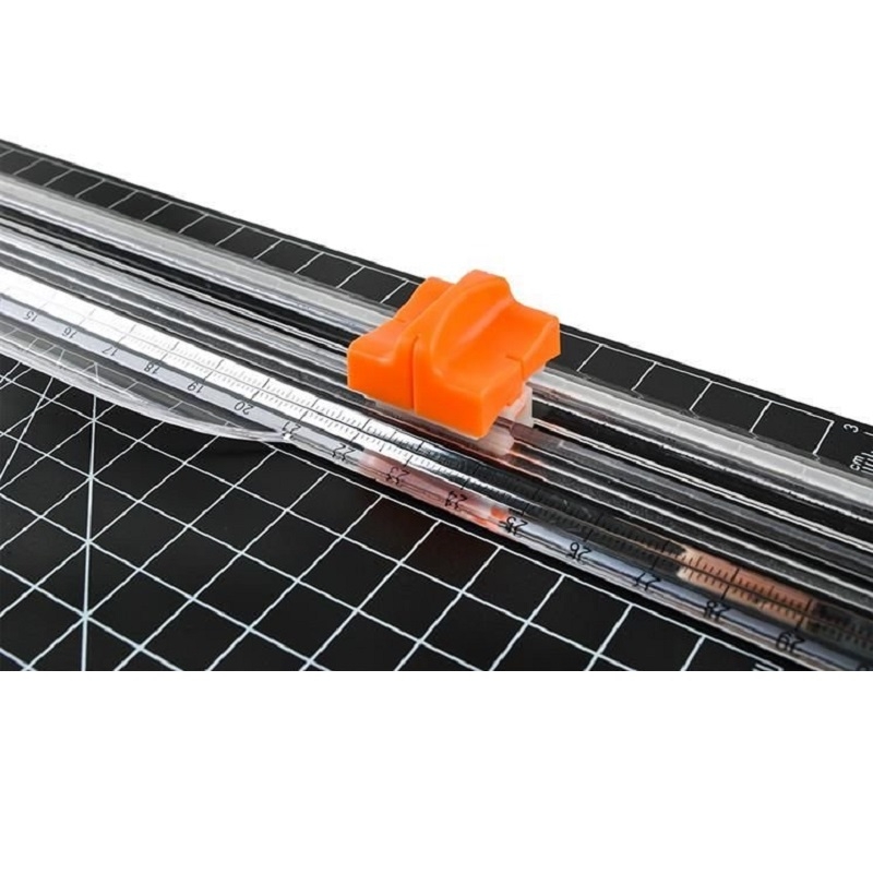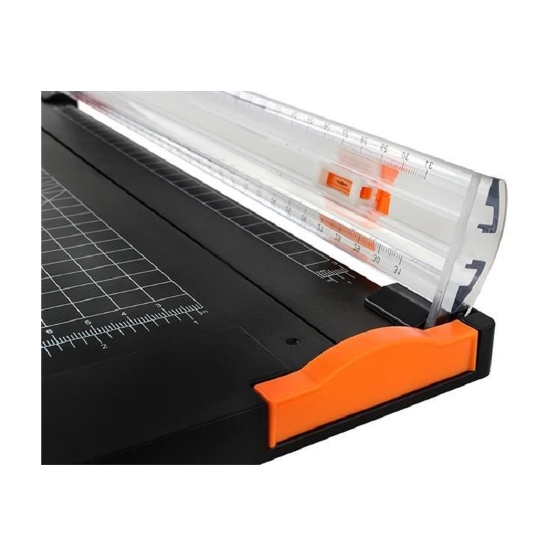 Dispozitivul de tăiat hârtie acceptă o gamă largă de dimensiuni, până la A3. Trimmerul este, prin urmare, universal și poate fi un instrument care va fi folosit cu succes în diverse sarcini. Lama precisă taie până la 12 coli de hârtie de până la 80 g/mp odată. Poziţionarea hârtiei şi determinarea liniei de tăiere este facilitată de gradaţia exprimată în centimetri şi inci. Ghilotina are, de asemenea, un marcaj unghiular care vă permite să tăiați hârtia la un unghi de la 45° la 90°. În cazul hârtiei de dimensiuni mai mici și lucrări mai simple, este suficient să folosiți o grilă de bază cu măsuri, iar pentru formate mai mari, o scară suplimentarătrebuie instalat pe partea de jos a dispozitivului.