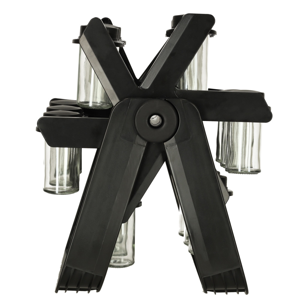 Un organizator elegant și practic, ideal pentru a păstra condimentele la îndemână pe blatul din bucătărie. Finisajul negru mat oferă un aspect modern și sofisticat, iar designul rotativ asigură acces ușor la toate recipientele.