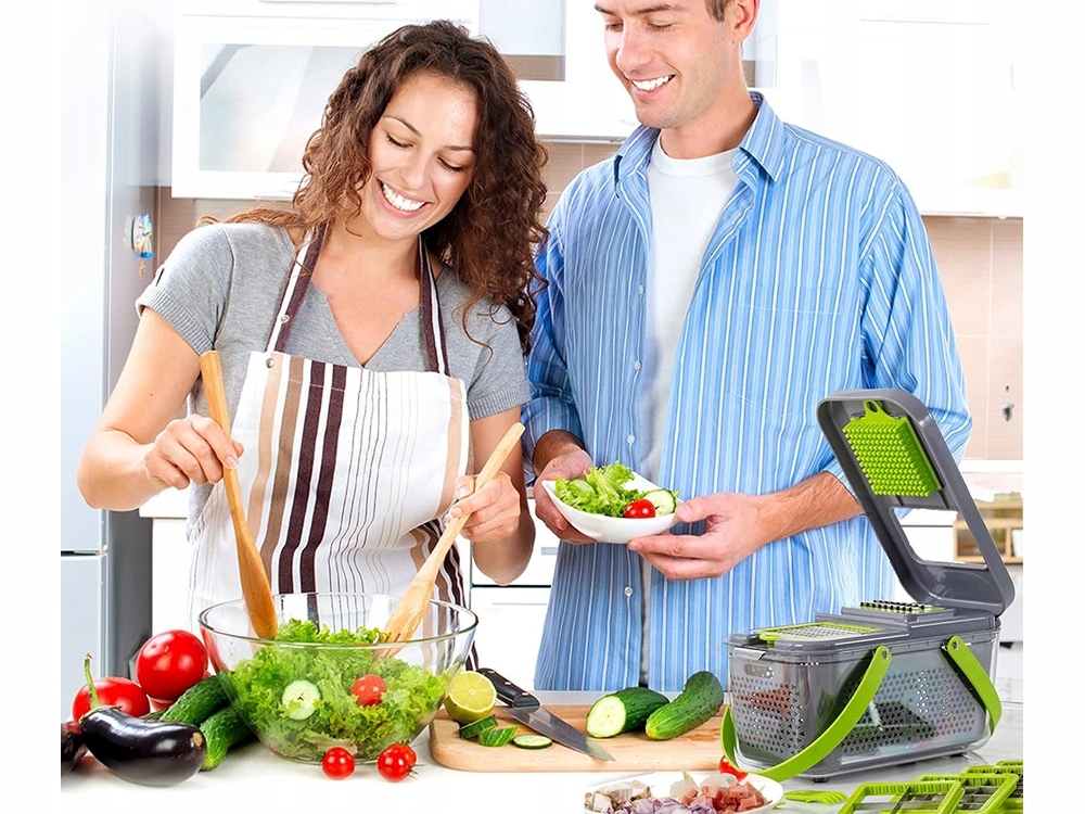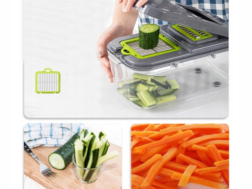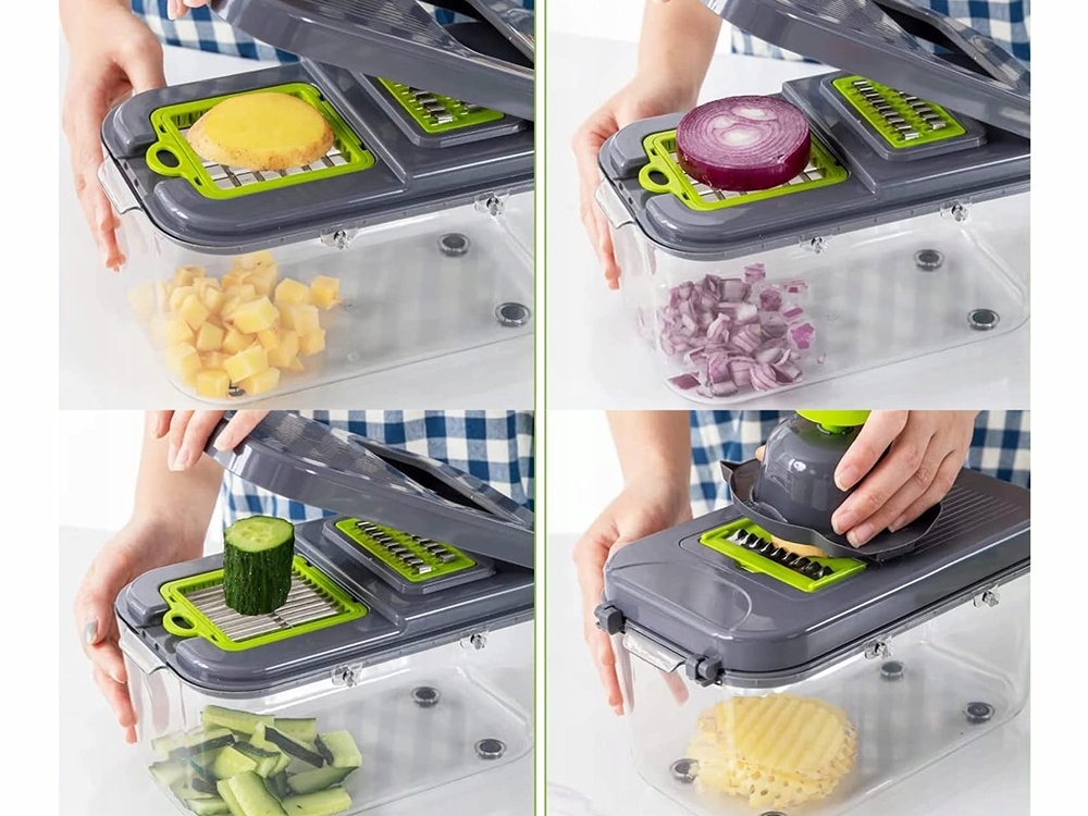 Razatoare multifunctionala pentru legume si fructe, 13 lame diferite, 5 accesorii, cu recipient transparent, Gonga®