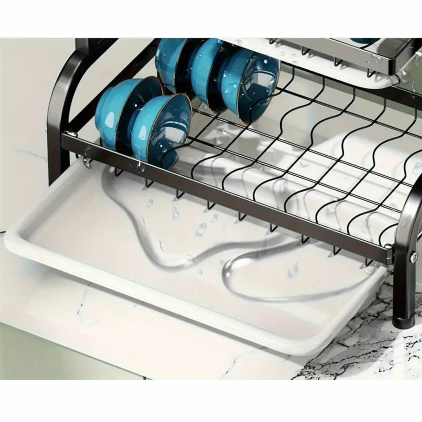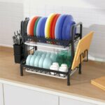 - Compact și versatil – include 1 coș pentru vase, 1 suport pentru ustensile, 1 suport pentru cuțit și tacâmuri, 1 suport pentru tocător și 2 tăvi detașabile pentru scurgere.