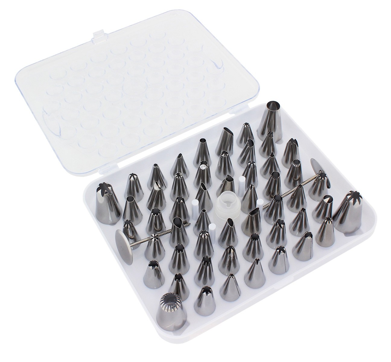 Un set perfect pentru decorarea prăjiturilor, constând din până la 54 de vârfuri diferite din oțel (ace de patiserie).