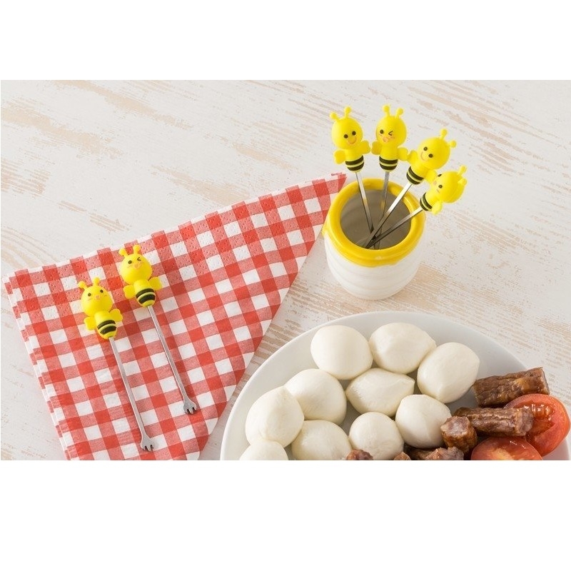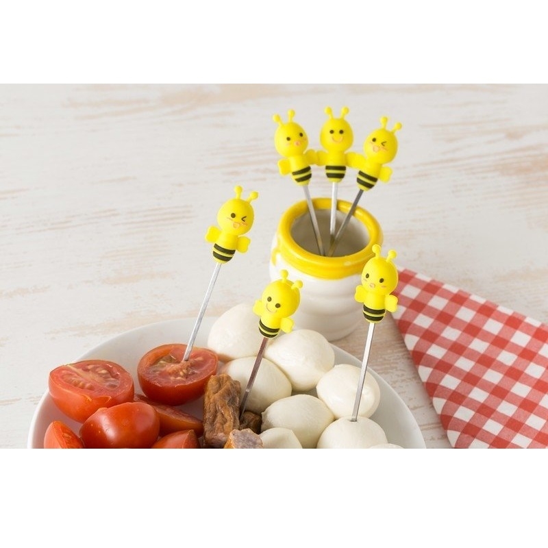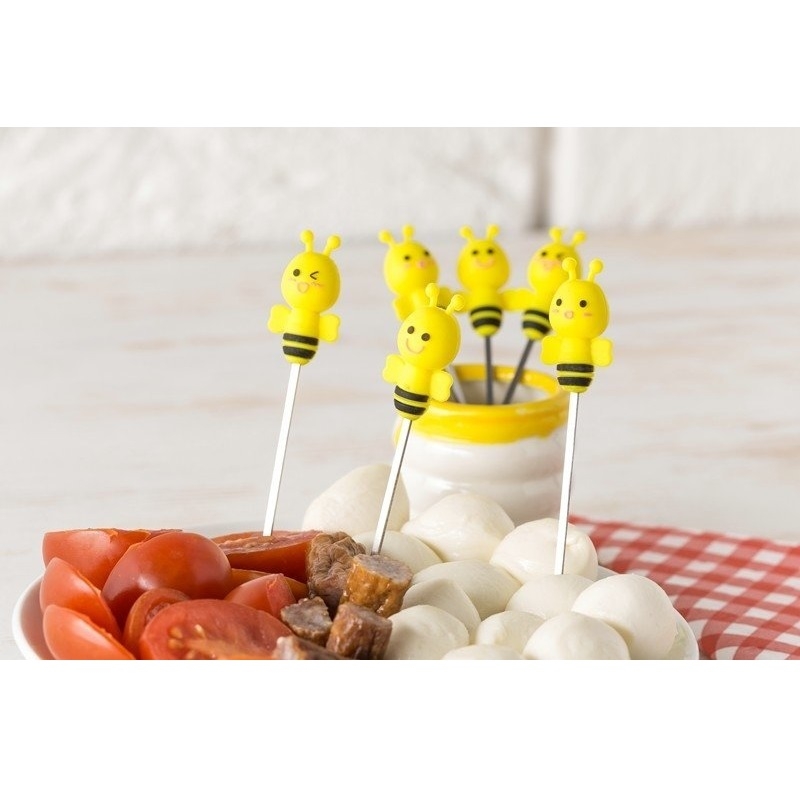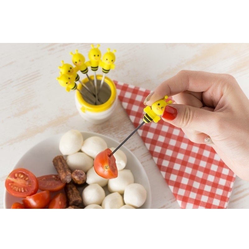 Un set de 6 furculițe pentru fructe, ce vin intr-un vas asortat din ceramică. Mânerele sunt concepute în formă de albină, si sunt fabricate din silicon pentru o prindere confortabilă.