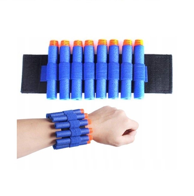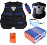Setul contine gloante din spuma, ochelari de protectie, bandana model craniu, banda pentru mana, vesta, cartus pentru gloante.
