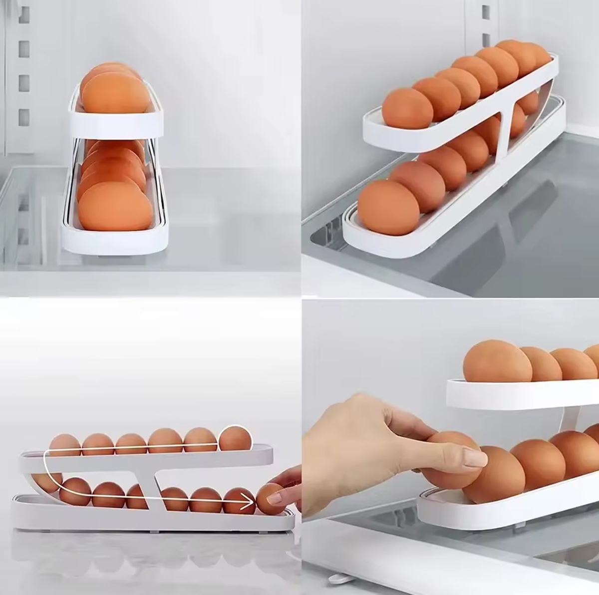 Designul inteligent permite ca ouăle să fie rânduite pe două niveluri, iar pe măsură ce folosești ouăle, cele din partea de sus se rostogolesc automat în față, pentru un acces convenabil. Este ideal pentru păstrarea ouălor într-un mod organizat, ajutându-te să economisești timp și spațiu. Perfect pentru orice frigider, acest organizator este un accesoriu practic și funcțional în bucătărie!